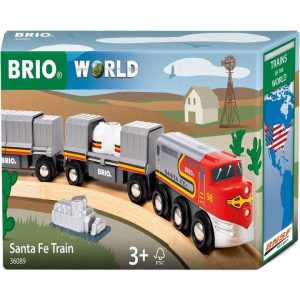 Hop aboard the Santa Fe Train! With its iconic “Warbonnet” livery, this wooden streamliner brings US railway history to your BRIO World. Ride one of the largest US railways on board the Santa Fe Train – part of the Trains of the World series. This wooden streamliner includes the iconic engine, two cargo wagons and two