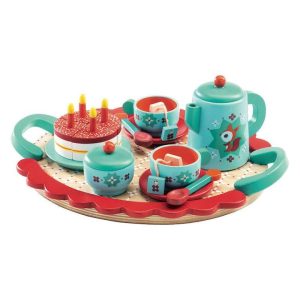 An adorable wooden tea set for birthday celebrations and enjoying tea with friends. Contents: 1 tray, 2 cups, 2 saucers, 2 teaspoons, 2 tea bags, 1 lidded teapot, 1 lidded sugar bowl, 1 plate with a cake divided into quarters with 4 candles. Product dimensions: 11.4" x 9.1" For ages 3 and up