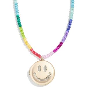 Good vibes, guaranteed! This necklace is adorned with a rainbow of beads and a gold smiley face locket. Sparkling with pavé detailing, it’s a cheerful, eye-catching piece that adds instant joy to your everyday look. Beaded necklace with smiley face locket Length: 16"; 3" extender. Materials: Glass stones. Brass casting