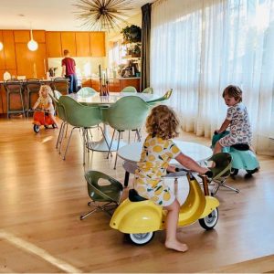 A very pretty ride on scooter in the best pink colour! A wicker basket lined with pink gingham to carry the groceries or teddy. The basket is attached with removable white tapes. Included is a set of pretty stickers! Good for pretend play. Good for social and language skills. SCOOT AND PLAY – Zoom, zoom!…