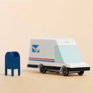 Our Mail Van 2.0 is here: It may look like an odd bird, but it has increased cargo capacity, and likely electric propulsion – all wrapped in a red-white-and-blue livery. Tiny package delivery ON TIME! Materials: Solid Beech Wood, water-based paint and clear urethane coat. ABS plastic rims, with plastic tires. Ages 3+