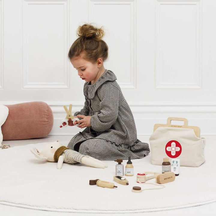 Our Animal Care Set is the perfect companion for imaginary pet owners and animal lovers alike! This veterinarian-inspired set includes a vintage style storage medical aid bag, which is equipped with everything required to give any animal the best of care! Featuring a sleek walnut stain finish and adorned with touches o