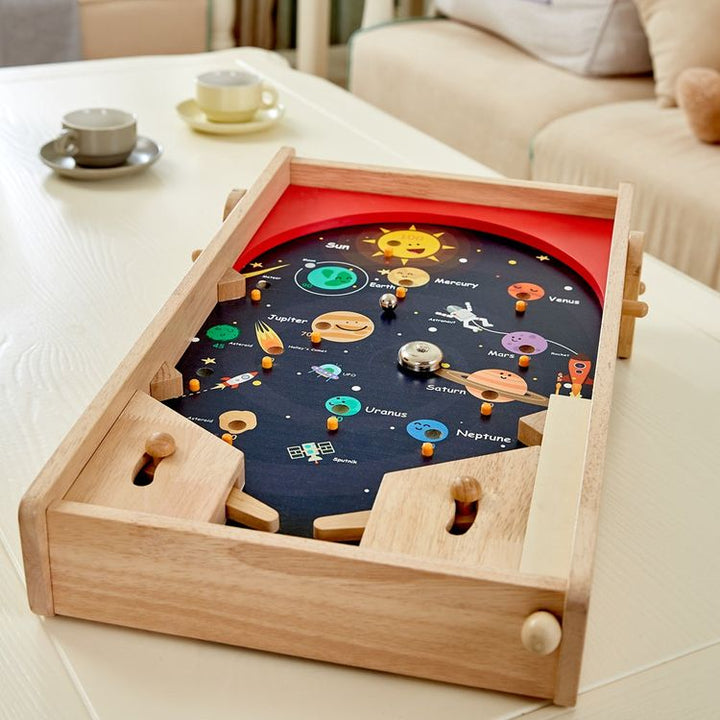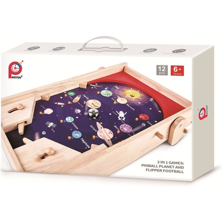 Pinball in space or soccer for two? High speed, hands on traditional table top games controlled with flippers improve hand eye co-ordination, fine motor skills, concentration and sportsmanship! Ages 3+ Materials: Wood, Steel Care instructions: Wipe with damp cloth, air dry; do not immerse in water PLEASE NOTE: This ite