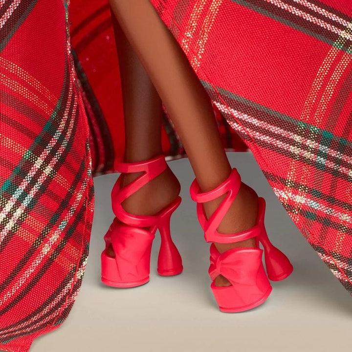 The 2024 Barbie Holiday Doll embodies the warmth and love of the season with a festive gown for a glamorous celebration. Showcasing gorgeous drama, the dress pairs a draping, one-shoulder, sparkling red bodice with a full, plaid ballgown-style skirt. Big tulle accents offer a modern take on a classic look, while statem