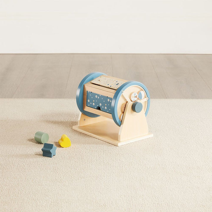 Your baby will rock and roll with our wooden Activity Roller.  This perfect tummy time toy can either sit in the base and whirl and twirl, or roll freely on the floor.  This quality interactive toy features a shape sorter with heart, star and circle shapes and a functioning door that opens to store and retrieve shapes