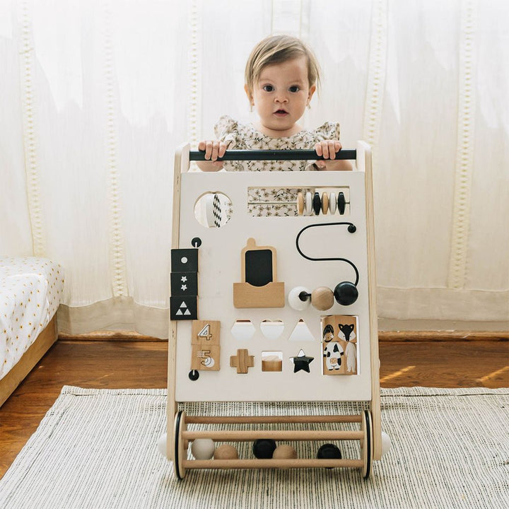 Whether your little one is a sitter, squatter, stander or walker, they will love our Awesome Activity Walker. The sitting baby can sort the 6 shapes into the shape sorter, where the hidden shelf will catch the pieces. They can also play with the cell phone that fits into its own holder. Or try the squares that make cha