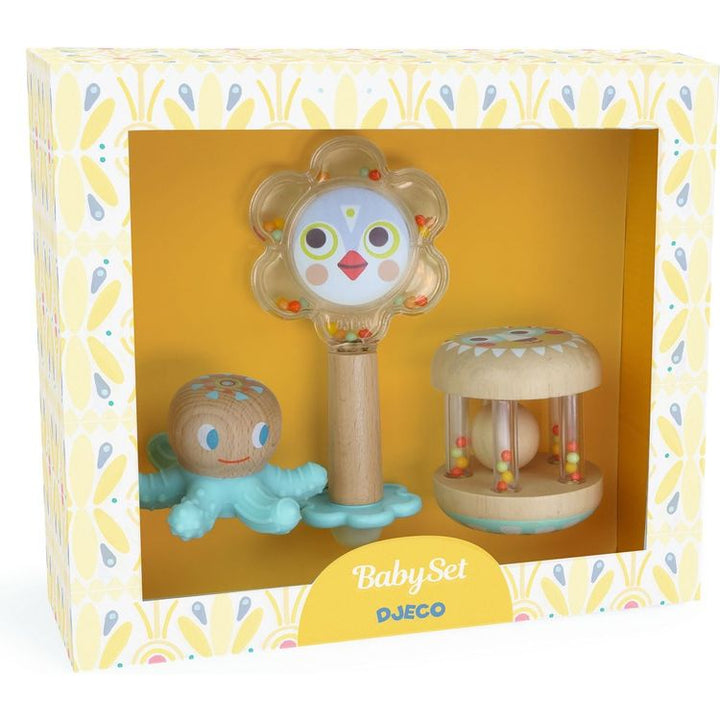 A baby set with a teething ring and two rattles. An octopus-shaped teething ring made of wood and soft silicone. A flower-shaped rattle with a sweet illustrated face on one side, and a mirror on the other for self discovery. A wooden rattle with small colored balls and a large wooden ball to watch and listen to. Conten
