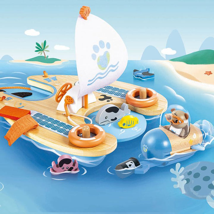 Discover ocean conservation with Ben the Otter and his Catamaran. This playset combines education and adventure, teaching children about protecting the seas. Ben's catamaran features a "solar-powered" submarine, so mini marine biologists can clean oil spills, rescue sea creatures, and understand the importance of carin