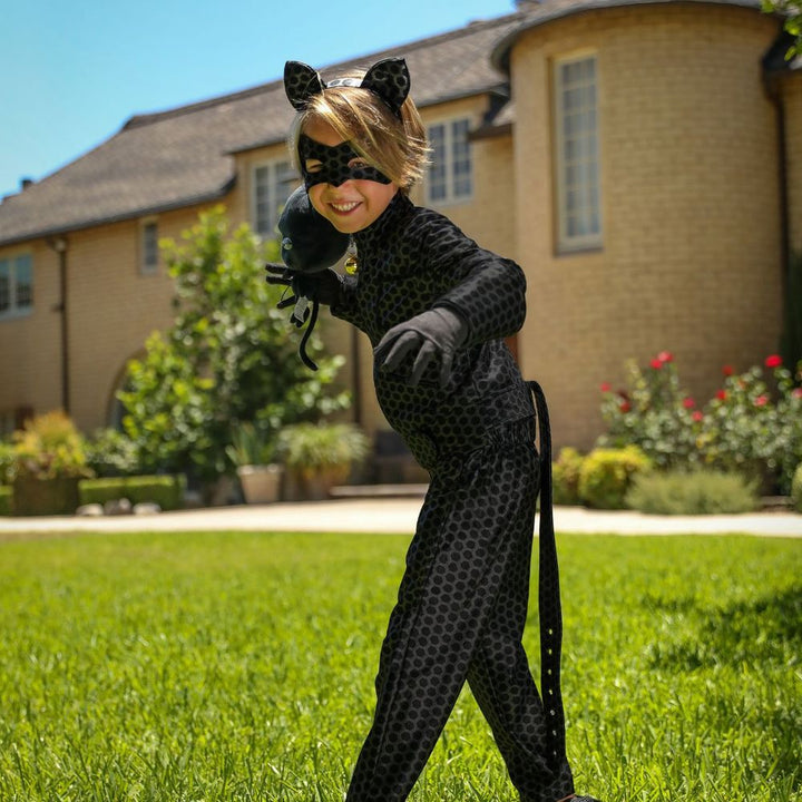 Unleash your inner feline hero with our A Leading Role Cat Noir Child Dress Up Set; the officially licensed Cat Noir 4 pc. costume set celebrates a decade of purr-fect partnership! Featuring an iconic ear headband, sleek eye mask, and a stylish zipper-front jacket with bell charm and belt tail detail, with matching pan