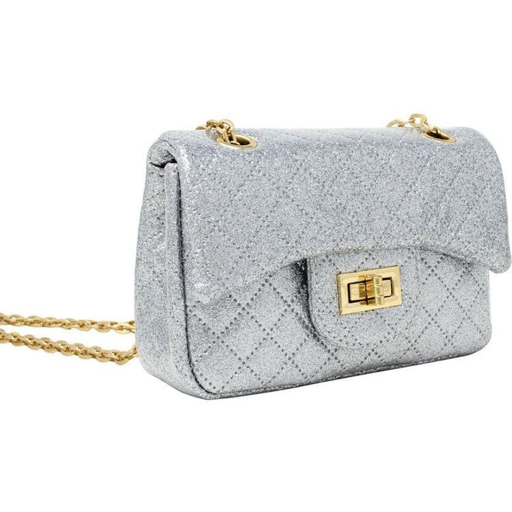 This classic quilted sparkle mini purse for kids is perfect for bringing along your glittery essentials! With it's sparkly quilted finish and gold-colored hardware & chain, you can be sure this mini handbag will draw attention and turn heads everywhere you go! Shiny quilted finish Twist lock closure Gold color hard