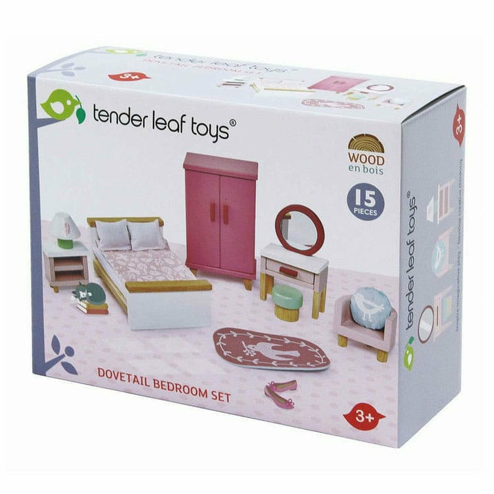 A perfect bedroom set, with double bed and stylish bedding, wardrobe, bedside table, lamp, dressing table, stool, printed rug, 3 clothes hangers and an on trend tub chair with printed cushion. Suitable for all the wooden dolls houses, as scaled to 1:12. COMPLETE BEDROOM SET: This dollhouse bedroom furniture set featur