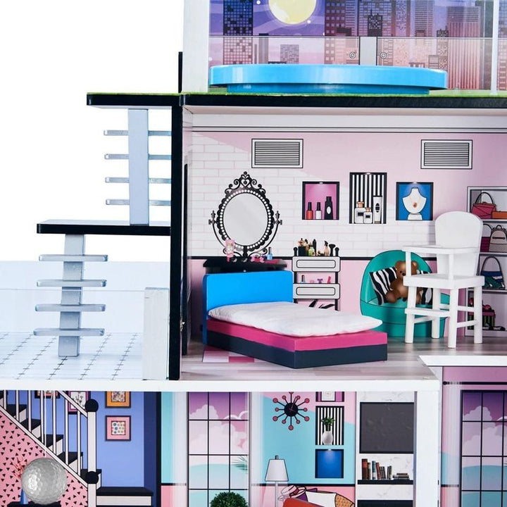Our exquisite Dreamland Barcelona Doll House is everything you could want in a doll house. With a working elevator to transport your dolls up and down, a floor lamp that actually turns on as well as a top panel on the food that can be flipped between a day or a night view. The walls are very vivid and detailed, complet