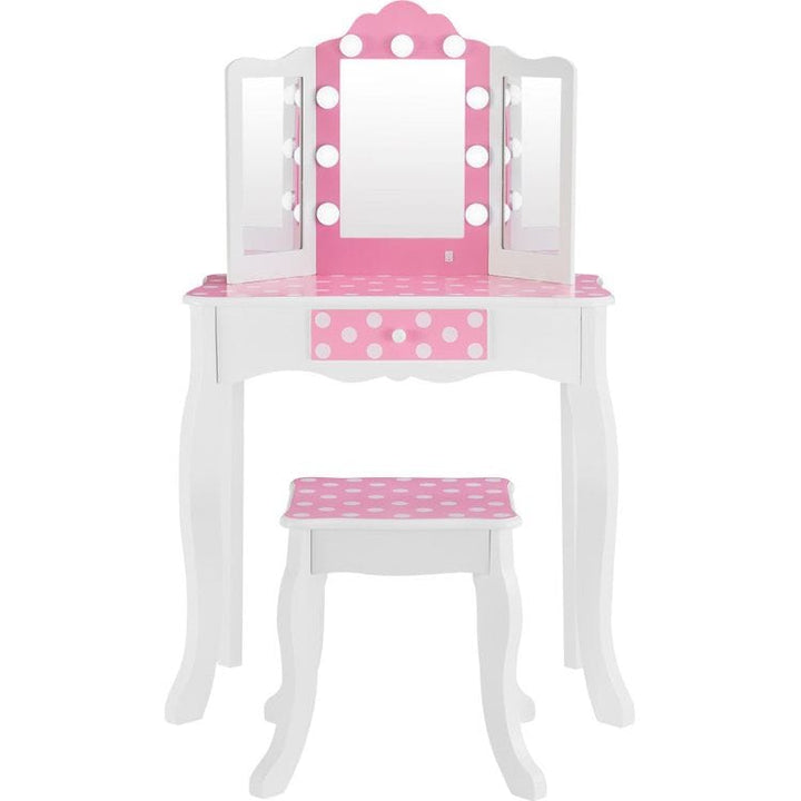 Gisele's Polka Dot Vanity Playset is a fun addition to playing dress-up. Made of engineered wood with rounded corners and cabriole legs, the vanity table features a tri-fold acrylic mirror with the central mirror surrounded by LED lights. White with pink and white polka dot accents, including on the central storage dra