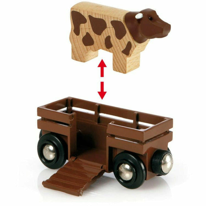 It’s hours of farm friendly fun with the Farm Railway set! Take the train out to the farm on the single loop track, past the cow grazing in the field and deliver the hay bales. Drive the train to the barn and unload the hay into the double height barn. The mechanical, magnetic crane hoists the hay into the hay loft f