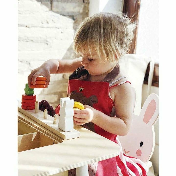 A stylish plywood table with a hidden compartment for crayons etc. under a chalkboard central panel. 2 plywood chairs, rabbit and bear themed. Perfect for ages 3+. Table Size: 22" x 22" x 17.6". Chair size: 11.8" x 11.8" x 20.3”. Product weight: 22.9 lbs. This item does not qualify for free shipping. An additional shi