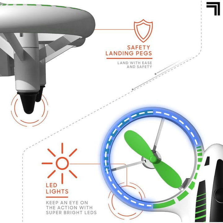 Flip, drift, and climb through the air with the Thunder Glow Drone from Sharper Image! Perfect for beginners, this compact copter and small remote are all you need to perform exciting stunts and fearless tricks! Glowing built-in LED lights make the stunts even more impressive, day or night. This impressive pint-sized p