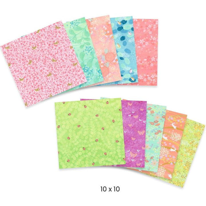 All sorts of paper with various poetic patterns so you can make your favorite folds. Includes 3 folds in spring Colors and step-by-step instructions. Traditional square format compatible with DJECO’s other origami products. Different patterns printed on each side. 3 folds provided. Contents: 100 sheets with 10 differen