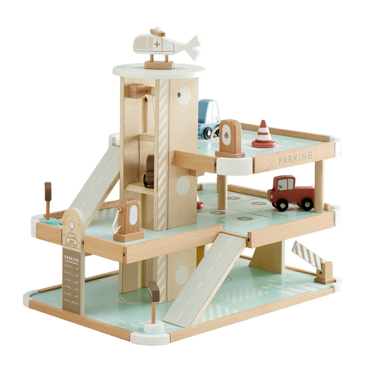 Your little tot will drive into fun with our Little Tot Parking Lot. Our quality wooden parking lot has 3 floors of imaginary play including ramps, helipad and helicopter, 3-floor crank elevator, 4 motor vehicles, safety cones, signs, gas pump and charging station, and more! Simple assembly, and you’re ready to go.Â