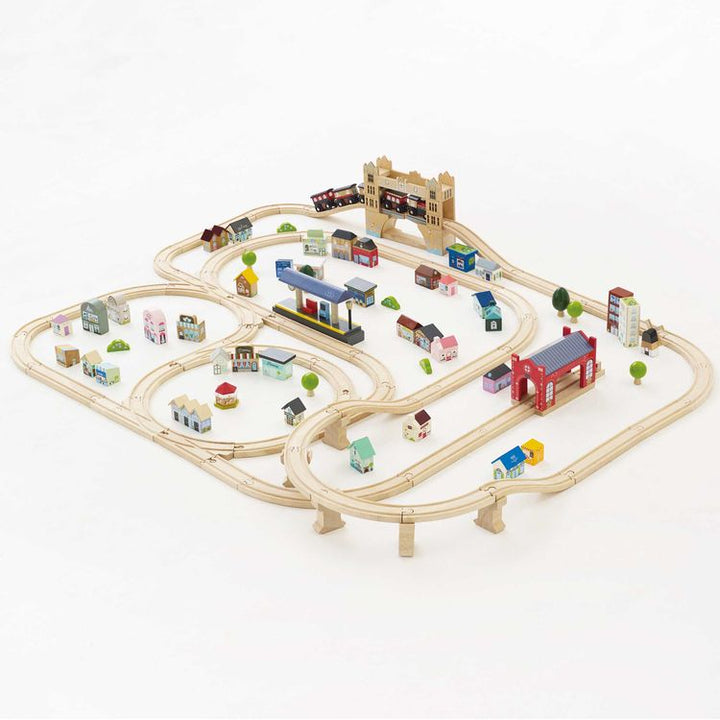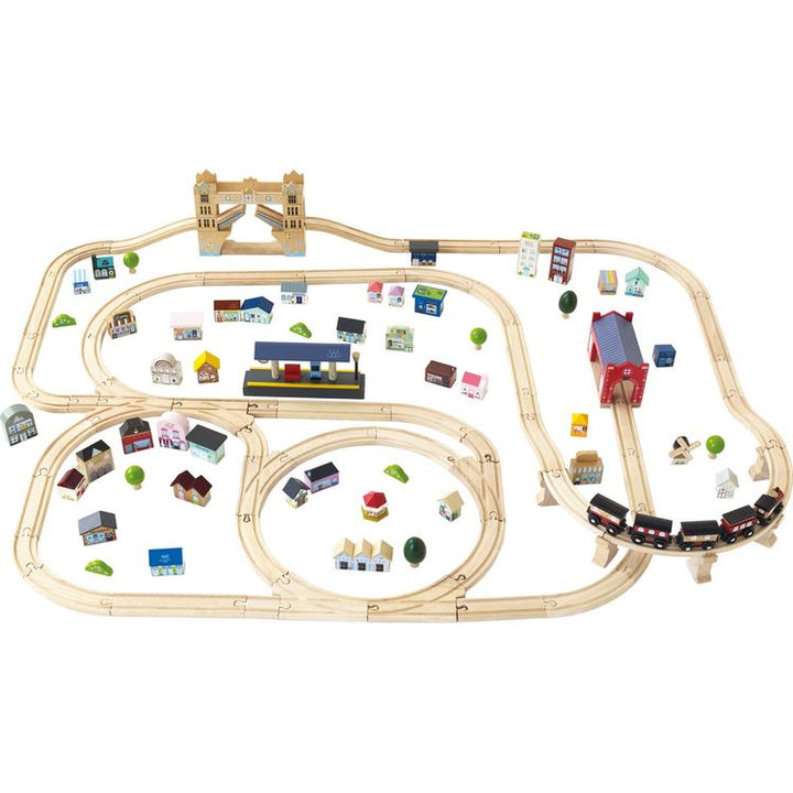 This 120-piece wooden train set features detailed artwork throughout, making play time a voyage of discovery. Stop by the beauty salon, the pet shop or even the pizzeria! The set consists of magnetic connectable train carriages, train tracks, train platforms, a variety of buildings and a lifting bridge. Train carriages