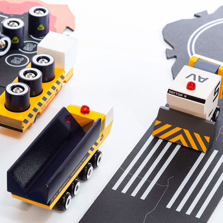MARGE: Mars Agency for Research + Geographical Exploration The Sector 9 play set includes the powerful and essential building vehicles of the MARGE team. What's in the box? AV-Dozzie with magnetic bulldozer blade MBT with suspension base M.R. Tanker with 6 magnetic fuel cells Puzzle roads Sector 9 Comic Book Dimensions