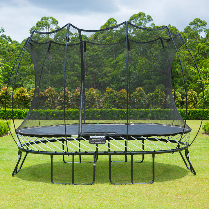 For the jumping enthusiast with a long and narrow yard. Perfect for the urban yard or tucked away in a space that is longer than wide. The Medium Oval trampoline provides 77 square feet of jumping freedom. Max Weight Capacity: 1500lbs Single Jumper Weight Capacity: 220lbs Trampoline Height: 9' Jumping Mat Dimensions: 8