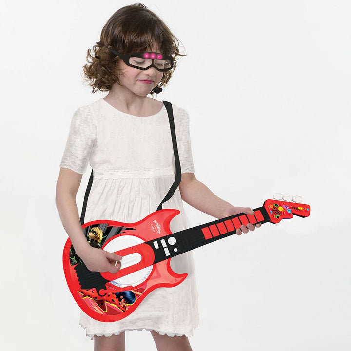 A great Ladybug electronic guitar and glasses with microphone to discover music while having fun and with style! 2 game modes are available for hours of fun: Mode 1: By pressing the guitar keys, the child can play frenzied guitar solos. Mode 2: By pressing the guitar keys, the child can play real notes and his own melo