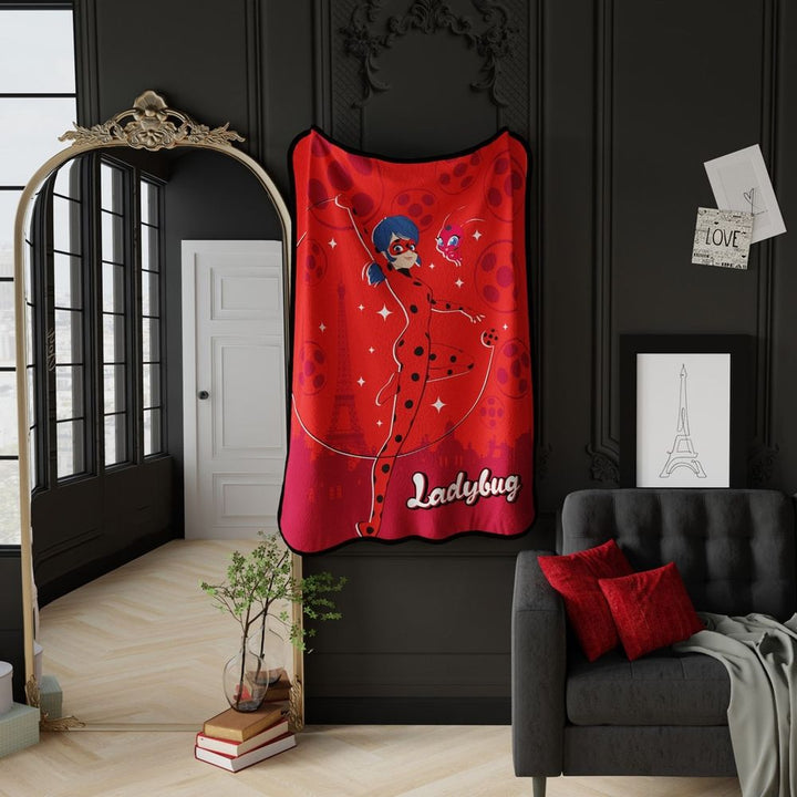 Elegant Miraculous Ladybug throw captures Ladybug poised against Parisian backdrop. The iconic Eiffel Tower rises in the background, all set against a bold red canvas. A chic and cozy homage to the beloved series and the City of Love. ITEM INCLUDES: Included is super soft throw measuring 46" (W) x 60" (L). Perfectly si