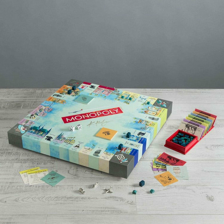 PLAY MONOPOLY WITH STYLE! Artist Kathleen Keifer has added a new twist that brings even more West Coast style to Monopoly California Dreaming. The Second Edition still features the hottest neighborhoods across the Golden State, but the artist swapped out the Jail space for a Pool Party! If you run into some bad luck, a