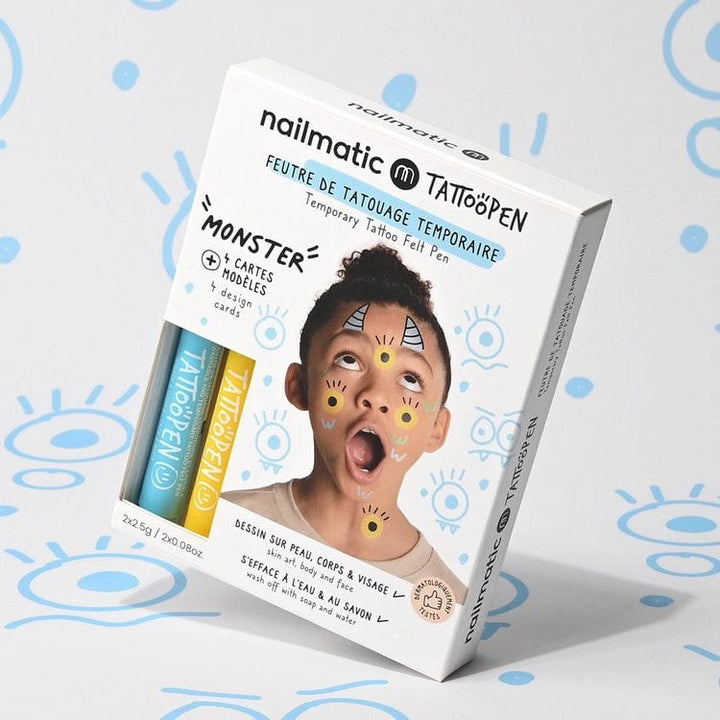 Let's have fun drawing on skin! 2 temporary tattoos felt pens, along with template cards to get inspired: your little monsters will have so much fun! Each card provides inspiration drawings on the front and photo renderings on skin on the back. A box of ideas for creating lots of monster tattoos, yuck and yay! You can