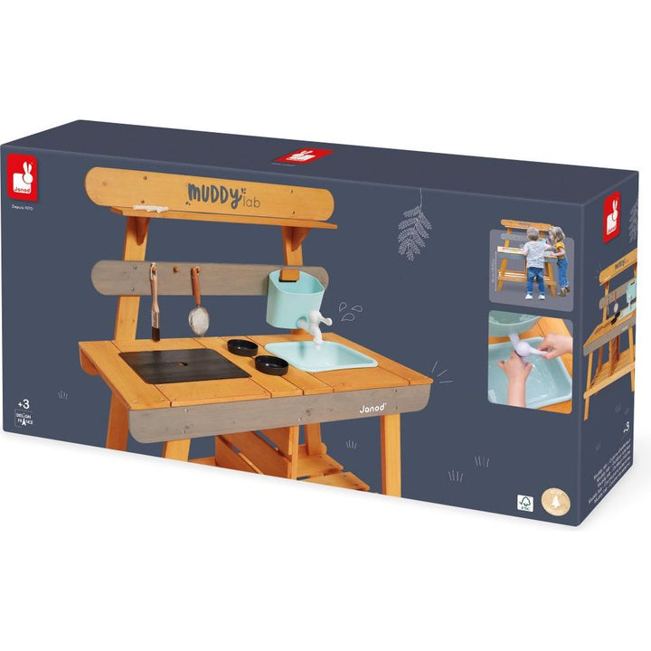 A bit of soil, a few blades of grass, some water, mix it all together, and you have the perfect mud workshop! Let your child thrive in nature and develop their imagination with this solid wood kitchen. Suitable for outdoor use, this toy will withstand all experiments by young and old alike. Delivered with 10 accessorie