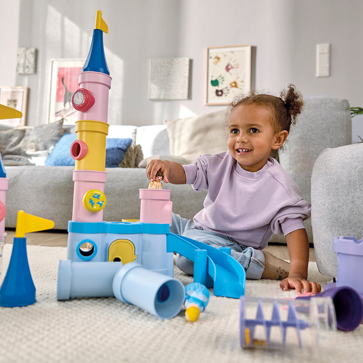 Calling all little builders! The princess castle, inspired by Disney's Cinderella, invites your child for endless exploration and tower combinations. Who can build the tallest tower and make it collapse first? Where is Cinderella's shoe hidden, and how can Cinderella quickly land in the arms of the prince? These questi