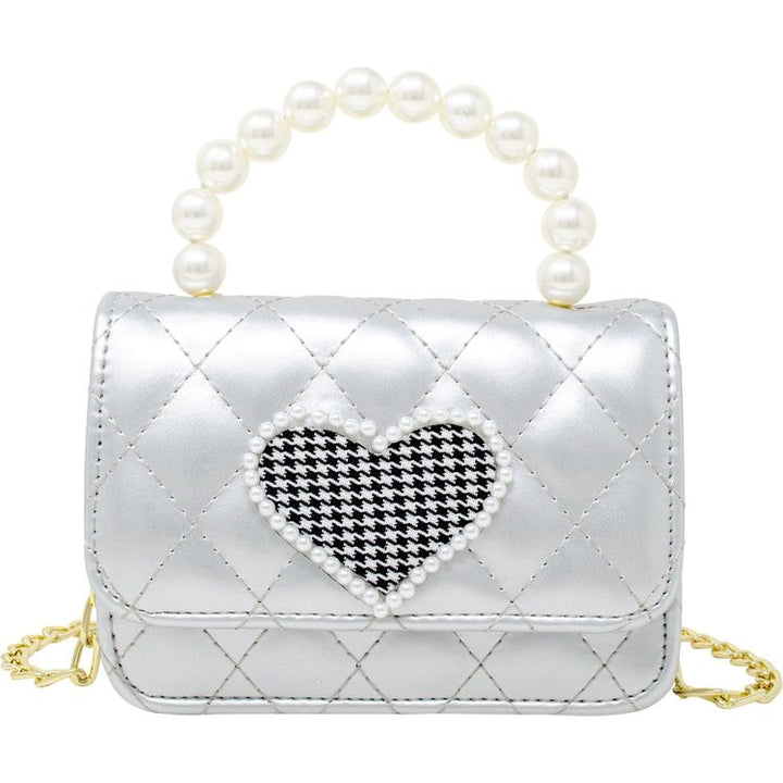 This Quilted Pearl Handle Heart Bag will have your little one feeling like royalty! Its chic houndstooth heart patch and pearls make it a stylish accessory, while the gold chain strap gives it a luxe touch. Perfect for any princess! Magnetic closure Goldstone hardware Pearls for handle  Dimensions: 6L x 2.5W x 4H (inc