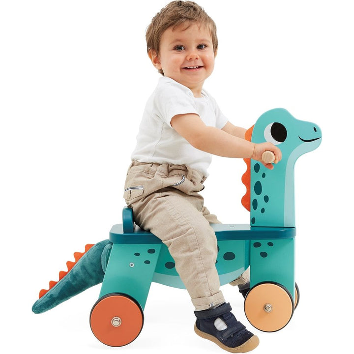 Watch out for the approaching Portosaurus! Go for long rides on this magnificent brachiosaurus. This ride-on toy is equipped with two directional wheels at the front to facilitate turning of all kinds. The wheels are equipped with silicon in order to be able to creep silently through the forest. The dinosaur's tail is