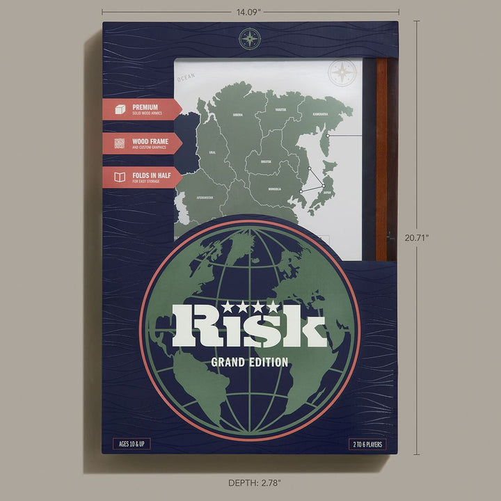 Dominate the world in style with this deluxe Grand Folding Edition of Risk, the classic game of military strategy. Command your forces on a beautifully framed wooden game board featuring customized graphics and a contemporary map design. Premium wooden armies enhance gameplay, while the redesigned cards provide fresh v