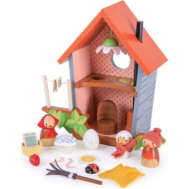 Meet Robin and his growing family! Mother Ruby and baby Rosy who has just hatched out are eagerly watching the egg upstairs! Ruby is busy washing the sheets and hanging them on the line, while preparing a meal of 2 juicy worms. A fold out printed backdrop completes the scene and encourages more storytelling! Good for i