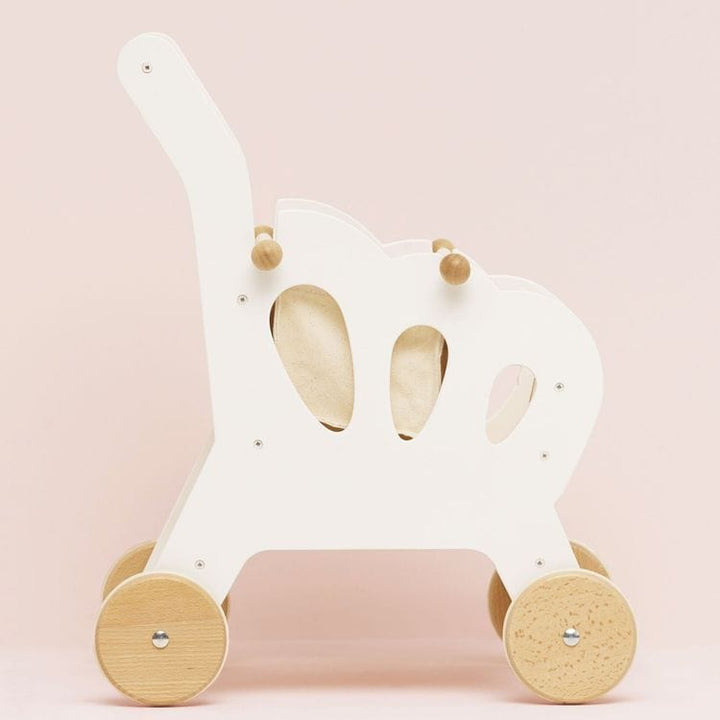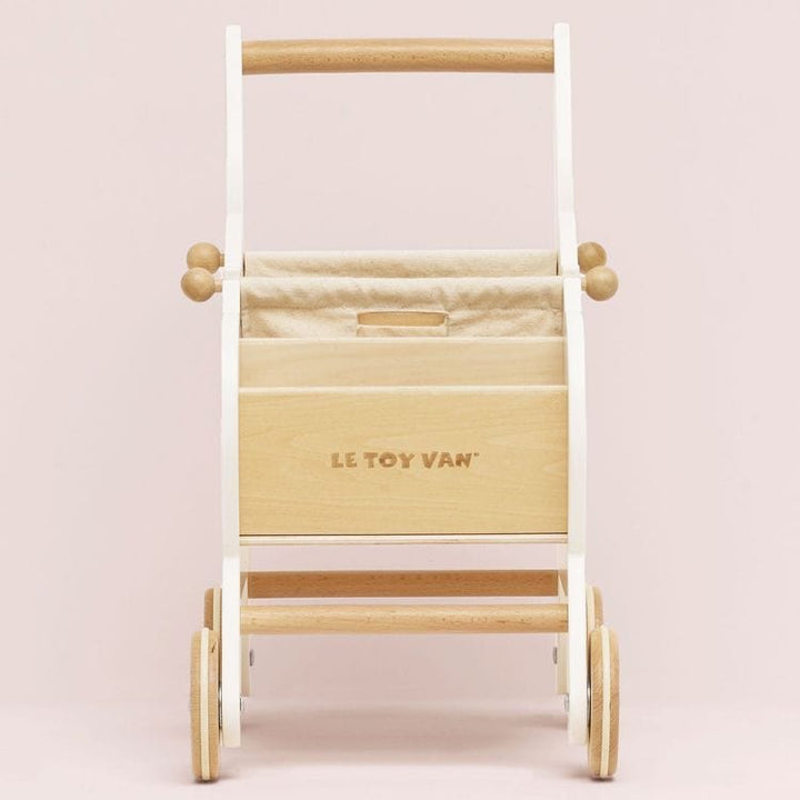 A stylish wooden shopping trolley with 2 internal compartments and a fabric storage level underneath. Special feature: a detachable high quality fabric shopping bag and a mini chalkboard. An addition to the Le Toy Van Honeybake role play collection. This shopping trolley is great fun and helps children developing thei