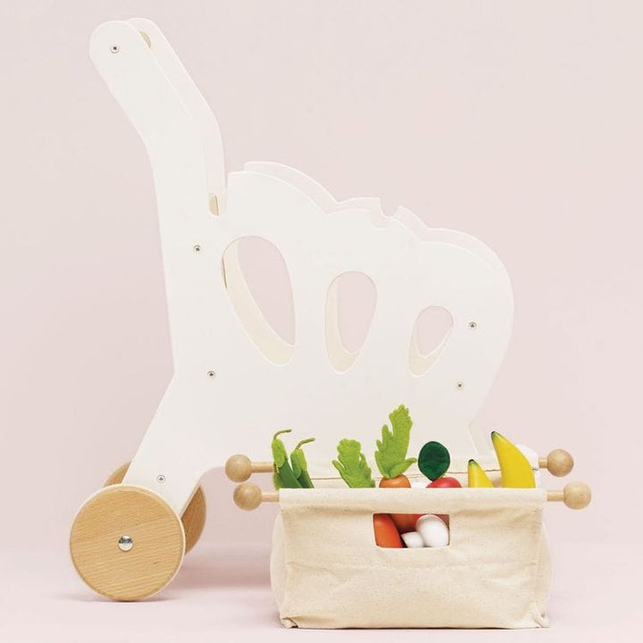 A stylish wooden shopping trolley with 2 internal compartments and a fabric storage level underneath. Special feature: a detachable high quality fabric shopping bag and a mini chalkboard. An addition to the Le Toy Van Honeybake role play collection. This shopping trolley is great fun and helps children developing thei