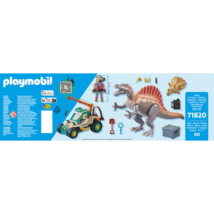 Join the researcher on an exciting excavation with the Spinosaurus Attack. Driving through the jungle, the researcher searches for the skull of a triceratops; however, he gets more than he bargained for when he runs into a vicious Spinosaurus. The researcher's car provides the perfect escape from the agressive dinosaur