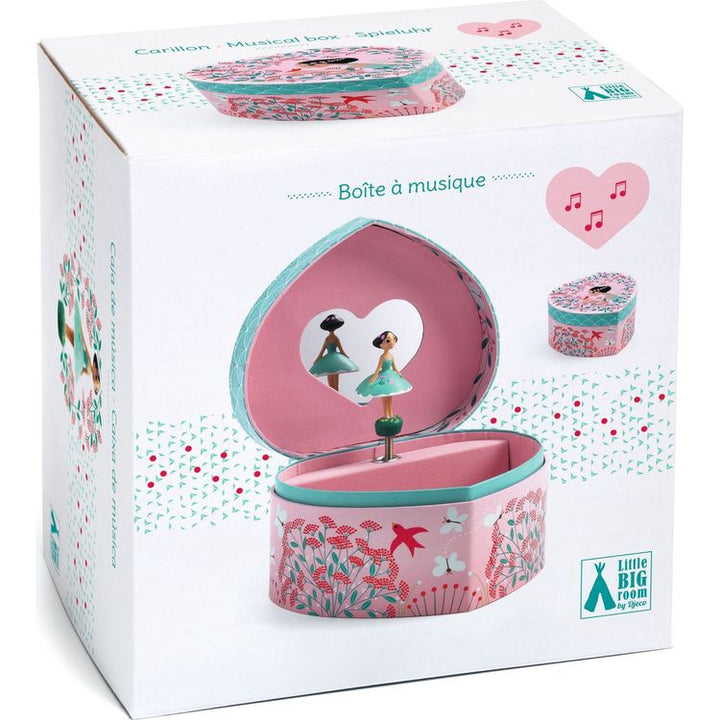 Spring Melody is a pretty, heart-shaped music box for keeping jewellery and secret things in. Turn the handle and open the box for a surprise! A delicately carved dancer turns, reflected in a shaped mirror, to Carl Maria Von Weber’s “Invitation to the Dance”. This beautiful music box in the shape of a heart is decorate