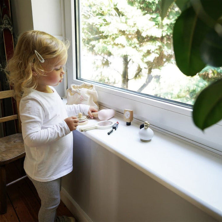 Be a star! Inside the cosmetics bag you'll find an assortment of wooden accessories including a vintage perfume bottle with a bulb atomiser, a hand held mirror, a hair dryer, a comb, a shell compact make up kit, a lotion, a nail varnish, a lipstick and a powder puff. Made from sustainable rubberwood, gold paint finish