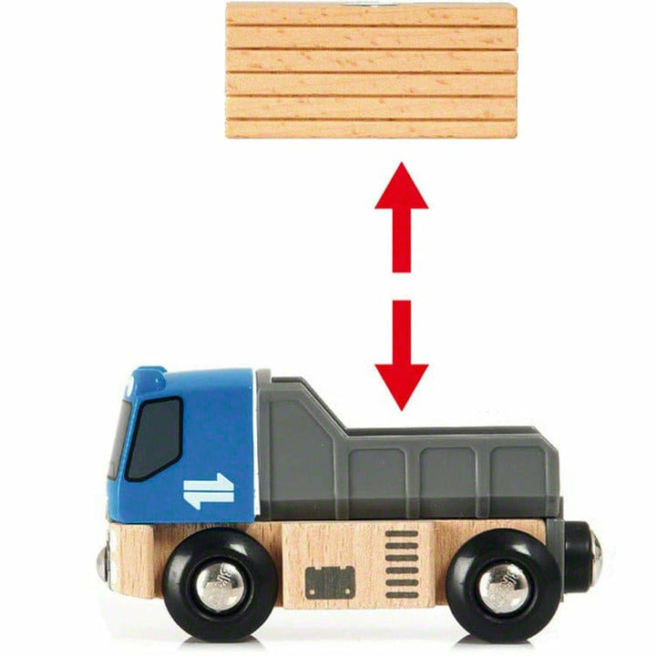 All aboard! Build your first BRIO World with this new lift and load starter wooden train set. The layout is packed with toys – a working crane, truck, a pop-up hood engine and wagon with load – even a warning sign, spruce and a small mountain to thunder through! Lift the cargo off the truck with the crane, turn and loa