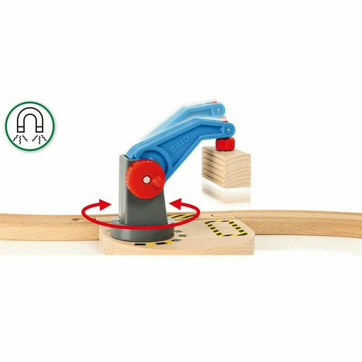 All aboard! Build your first BRIO World with this new lift and load starter wooden train set. The layout is packed with toys – a working crane, truck, a pop-up hood engine and wagon with load – even a warning sign, spruce and a small mountain to thunder through! Lift the cargo off the truck with the crane, turn and loa
