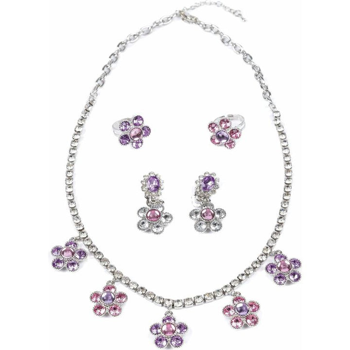 Sweet meets sophistication in The Audrey 5-piece jewellery set. This elegant boxed set includes two rings, a pair of clip-on earrings, and a matching necklace, all accented by floral-shaped charms and studded with soft pink, diamond, and lilac coloured gems.