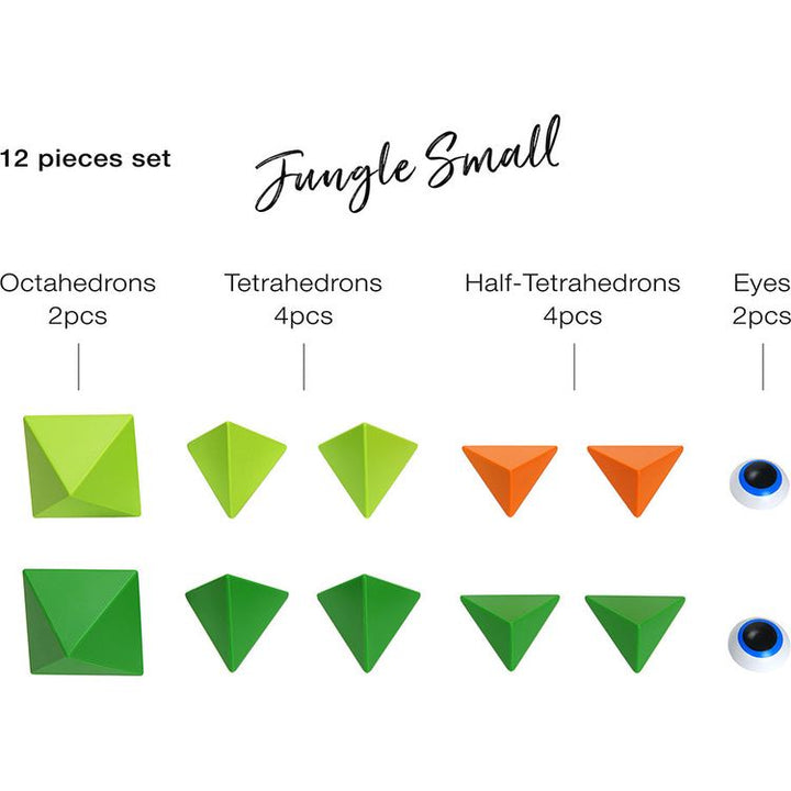 Bright Jungle colors abound in this 12 piece set with 2 octahedrons, 4 tetrahedrons, 4 half-tetrahedrons, 2 eyes (in total 12 pieces) + Leaflet. A Small Set is an introduction to Trido and is a perfect companion for a journey or a desk work. Ages 3Y+Â Materials: ABS PP magnetite Care instructions: Wipe with damp cloth,