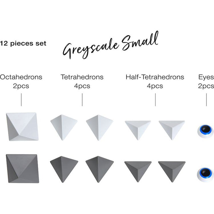 Grey and white pieces make up the monochromatic set which comes with 2 octahedrons, 4 tetrahedrons, 4 half-tetrahedrons, 2 eyes (in total 12 pieces) + Leaflet. A Small Set is an introduction to Trido and is a perfect companion for a journey or a desk work. Ages 3Y+ Materials: ABS PP magnetite Care instructions: Wipe wi