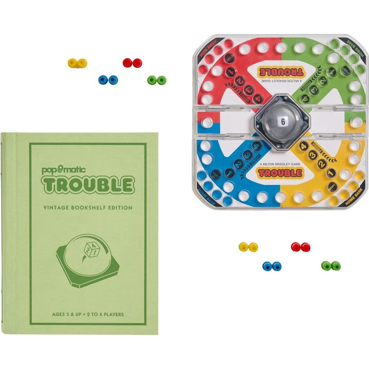 This Vintage Bookshelf Edition of TROUBLE brings a pop of fun to family game night! Push the Pop-O-Matic die roller, then race to get all your pieces home—but watch out, or you might get bumped back to the start! Inspired by the 1986 edition, this collectible, fabric-wrapped book brings back the fun and nostalgia of th