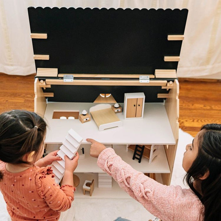 Our Dollhouse can be called “Home Sweet Home” for all your little one’s little ones. One side of the house boasts 5 4-pane windows with shutters and a dormer on the top floor. Flip it around, and there are 2 stories with 4 rooms ready for furniture. Lift the roof, and you’ll find the bonus room. Two sets of stairs