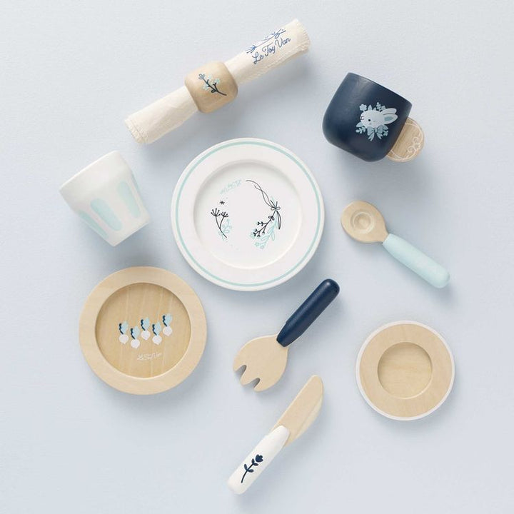 Dinner is served with our stylish wooden cutlery dining set, a wonderful gender neutral toy that's full of fun, sustainable and made to last. Painted in blue and white tones and decorated with pretty botanical illustrations, this cute roleplay toy features a full place setting including mug, coaster, cup, 2 plates, kni